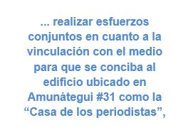 Lorena Parra, vicepresidenta nacional del Colegio de Periodistas, destacó la necesidad de realizar esfuerzos conjuntos en cuanto a la vinculación con el medio para que se conciba al edificio ubicado en Amunátegui #31 como la “Casa de los periodistas”, precisando que se trata de la estructura donde se encuentran emplazadas la biblioteca y oficinas del Círculo de Periodistas, el Colegio de Periodistas y el icónico Teatro Camilo Henríquez. Federico Gana, miembro del directorio del Círculo, coincidió con Parra y planteó la posibilidad de realizar remodelaciones al edificio institucional para mejorar la fachada de la construcción.