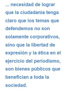 La Secretaria general del Círculo, Mónica Silva Monge, propuso dar vida a una coordinadora de todos los gremios periodísticos, enfatizando en la necesidad de lograr que la ciudadanía tenga claro que los temas que defendemos no son solamente corporativos, sino que la libertad de expresión y la ética en el ejercicio del periodismo, son bienes públicos que benefician a toda la sociedad.