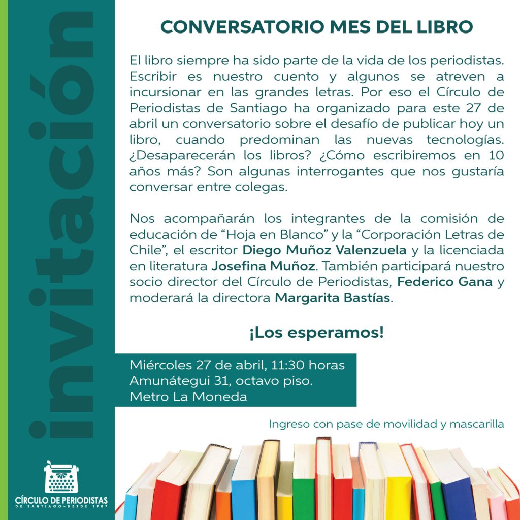 – Un conversatorio el día miércoles 27 de abril, a las 11:30 horas, para el cual contaremos con la participación de los integrantes de la «Corporación Letras de Chile» y de las comisiones de cultura y educación de «Hoja en Blanco», el escritor Diego Muñoz Valenzuela y la licenciada en literatura Josefina Muñoz, así como de nuestro socio y Director del Círculo de Periodistas, Federico Gana. Moderará la periodista Margarita Bastías.