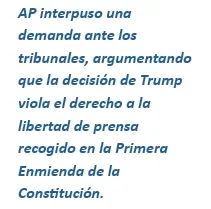 AP interpuso una demanda ante los tribunales, argumentando que la decisión de Trump viola el derecho a la libertad de prensa recogido en la Primera Enmienda de la Constitución. Sin embargo, el lunes un juez determinó que la Administración podrá seguir vetando su acceso, aunque le pidió reconsiderar su decisión.